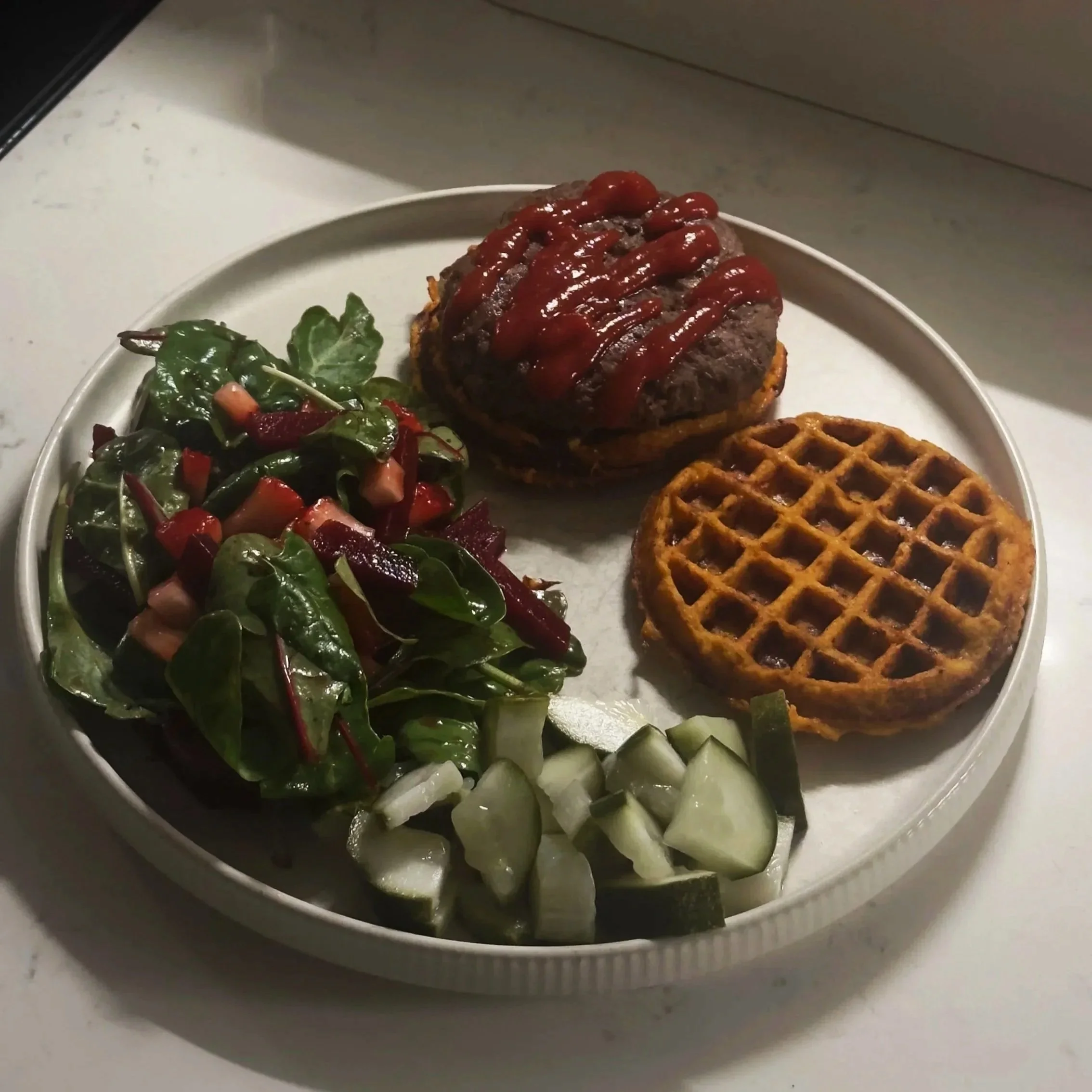 These sweet potato waffle burgers are the perfect balance of savory + sweet! Juicy grass-fed beef, crispy sweet potato waffles, and a fresh beet and strawberry salad come together for a nutrient-dense, satisfying meal you’ll want to make on repeat. Perfect for a fun weeknight dinner or healthy comfort food craving!